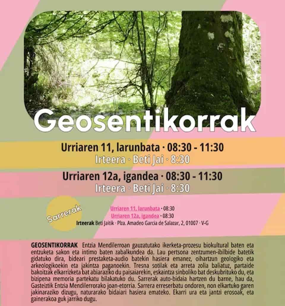 Geosensibles es la apertura de un proceso de investigación biocultural y una experiencia íntima de escucha profunda en la Sierra de Entzia. Cuatro personas son guiadas en un recorrido sensorial que comienza con un audio preparatorio con ecos geológicos, arqueológicos y saberes paganos. A través de herramientas sutiles y una atención afinada, cada participante entra en diálogo con el paisaje, descubre una ofrenda simbólica y transforma la vivencia en memoria compartida. La entrada incluye el traslado en coche, ida y vuelta, entre Vitoria-Gasteiz y la Sierra de Entzia. Una vez reservada tu entrada recibirás información acerca del punto de encuentro en el que nos reuniremos para comenzar nuestro viaje hacia la naturaleza. Trae agua y ropa cómoda, lo demás lo ponemos nosotras.