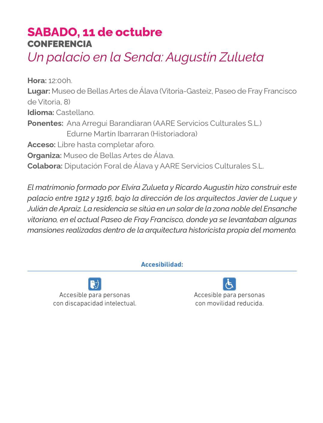 Un Palacio en la Senda: Augustin Zulueta Charla con Ana Arregui Barandiaran y Edurne Martín Ibarraran. Fecha 11 Oct 2025 Hora 12:00 Lugar Museo de Bellas Artes Fray Francisco de Vitoria Ibilbidea 8 Categoría Charla Compartir este evento